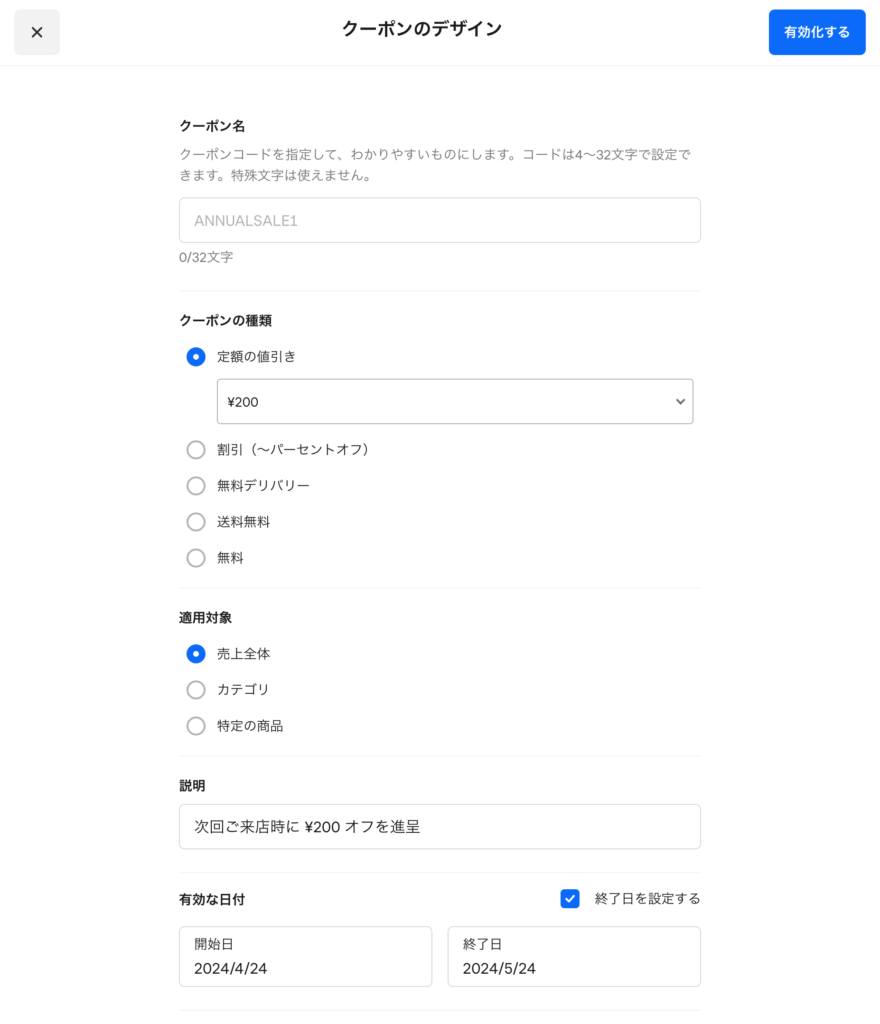 - STEP3クーポンの有効化全ての情報を入力したら、[有効化する] ボタンをクリックしてクーポンをアクティブにします。