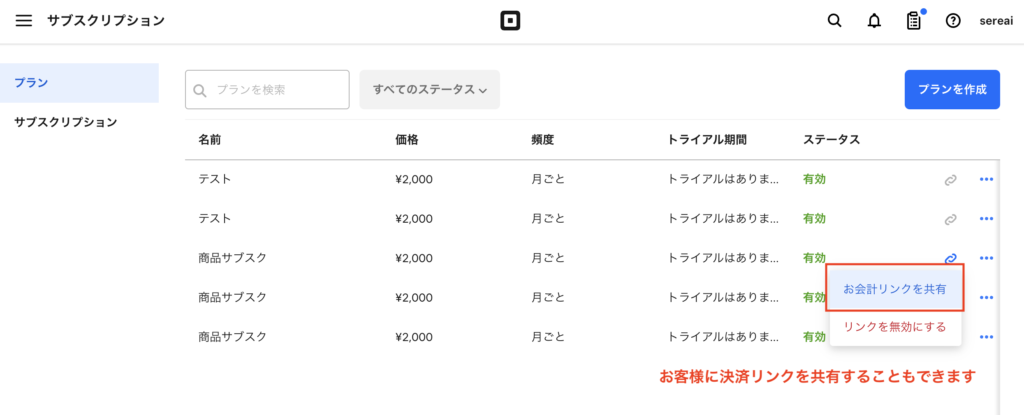 具体的には、管理画面でプランを作成し、お客様に決済リンクを共有していただき、そのリンクをクリックすることでサブスクリプションが開始されます。