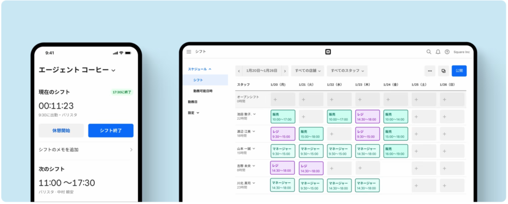 Square シフトはPOSシステムと連携し、リアルタイムで勤怠データを追跡できます。これにより、スタッフの出退勤情報を常に把握でき、適切なシフト調整が可能です。