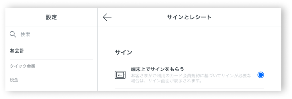 - STEP2アプリでサインの設定[設定] > [お会計] > [サインとレシート] >「端末上でサインをもらう」が選択されていることを確認する