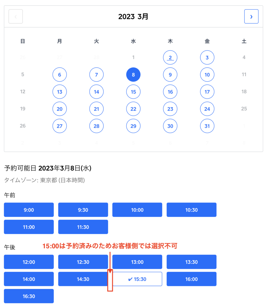 例えば、スクエアなら、すでに予約が入っている15時の予約は、予約フォームで選択できないようになります。