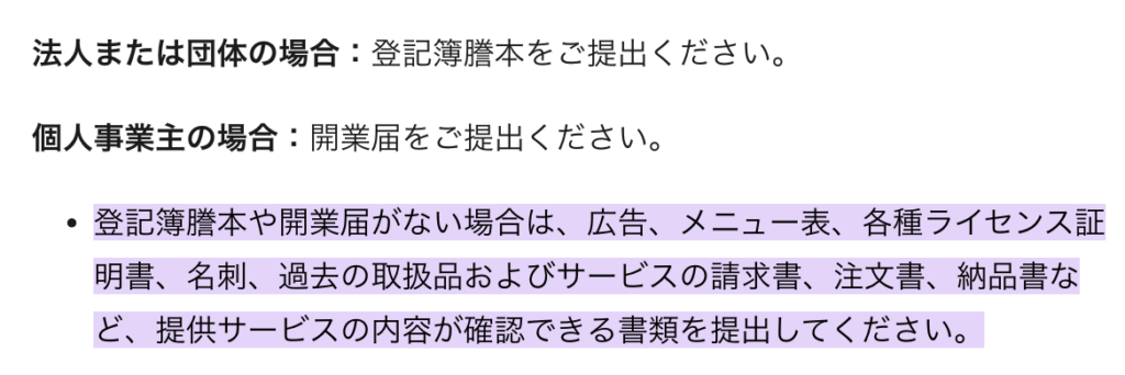 審査途中で書類が求められる場合には、法人/団体の場合は登記簿謄本、個人事業主の場合は開業届が必要ですが、これらの書類が手元にない場合でも、提供サービスの内容が確認できる書類を提出することで対応できます。